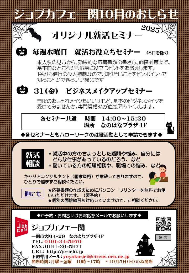 ジョブカフェ一関では、 この地域で働こうとされている方々、働いている方々へのバックアップをしています。 就活の始まりである「求人票の見方」から「応募書類」の書き方、その応募の仕方や、 実際に面接となった際の面接練習や効果的な自己PR、応募書類の写真や面接での 好感のもてるビジネスメイクアップセミナーなどを開いております。 また、国家資格であるキャリアコンサルタントが常駐しておりますので、 就職活動だけでなく、就職してからの相談、転職の相談なども承ります。 (注:就職の斡旋はしておりません) キャリア教育支援事業として、中学生の社会体験学習、高校生や短大、職業訓練校 において、就職ガイダンスや模擬面接やビジネスマナーセミナーなどを行っております。