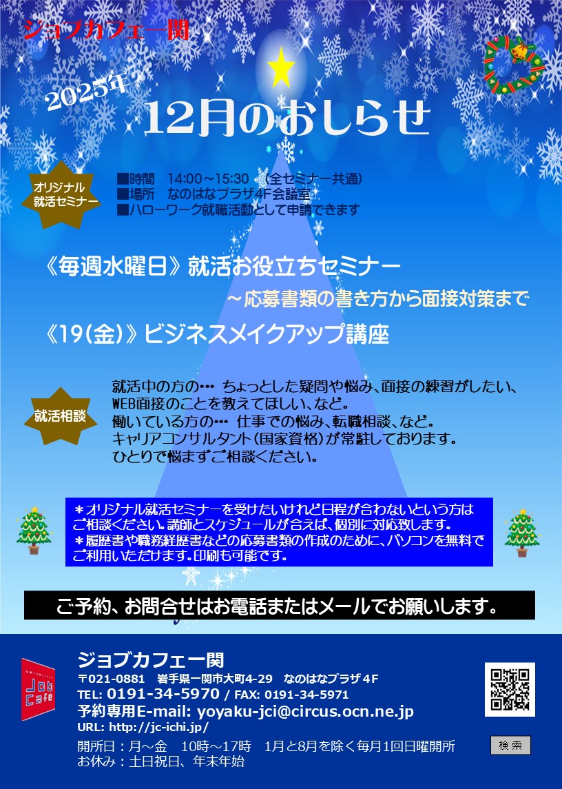 年末年始のジョブカフェ一関は、12月27日(土)から新年1月4日(日)までお休みいたします。